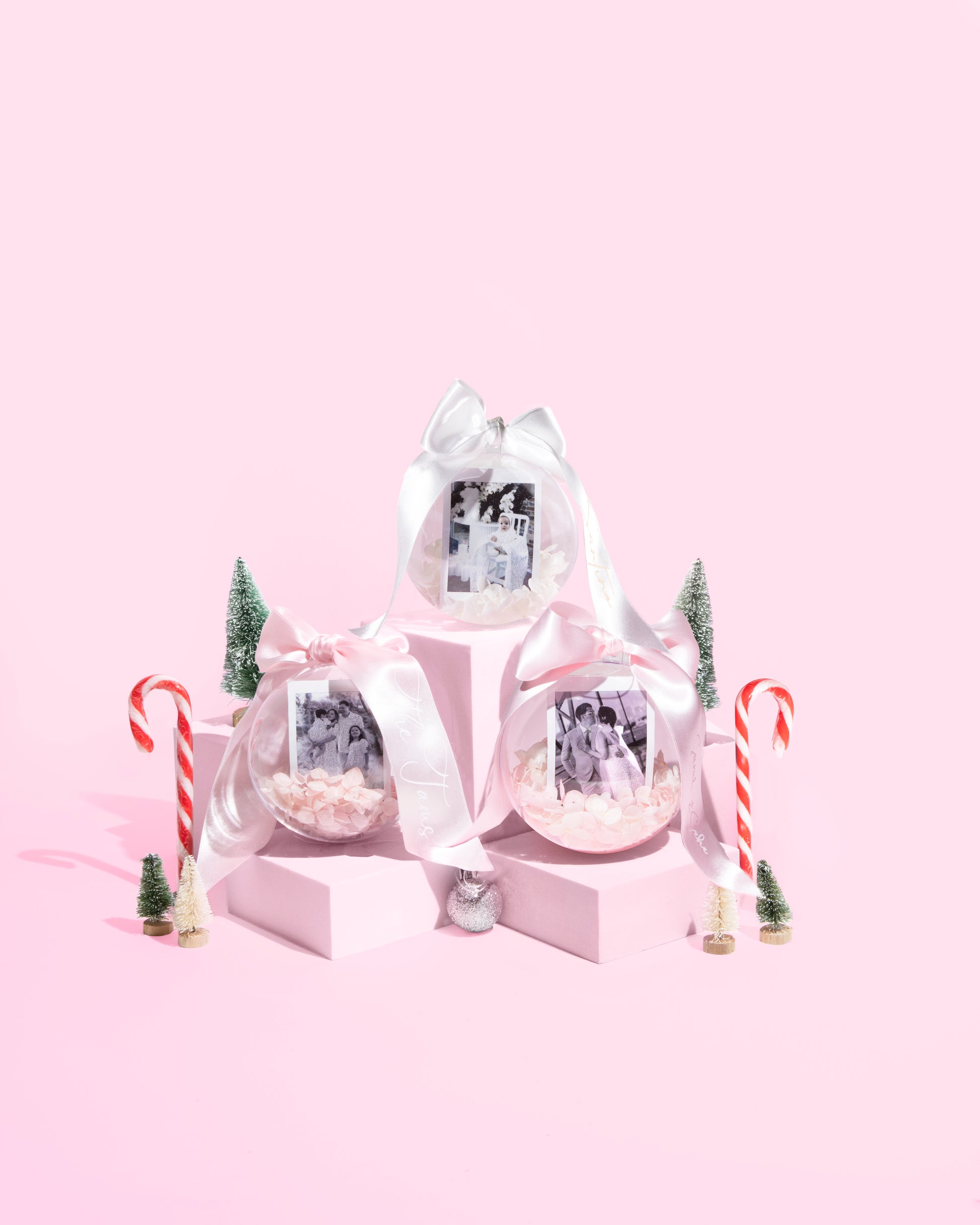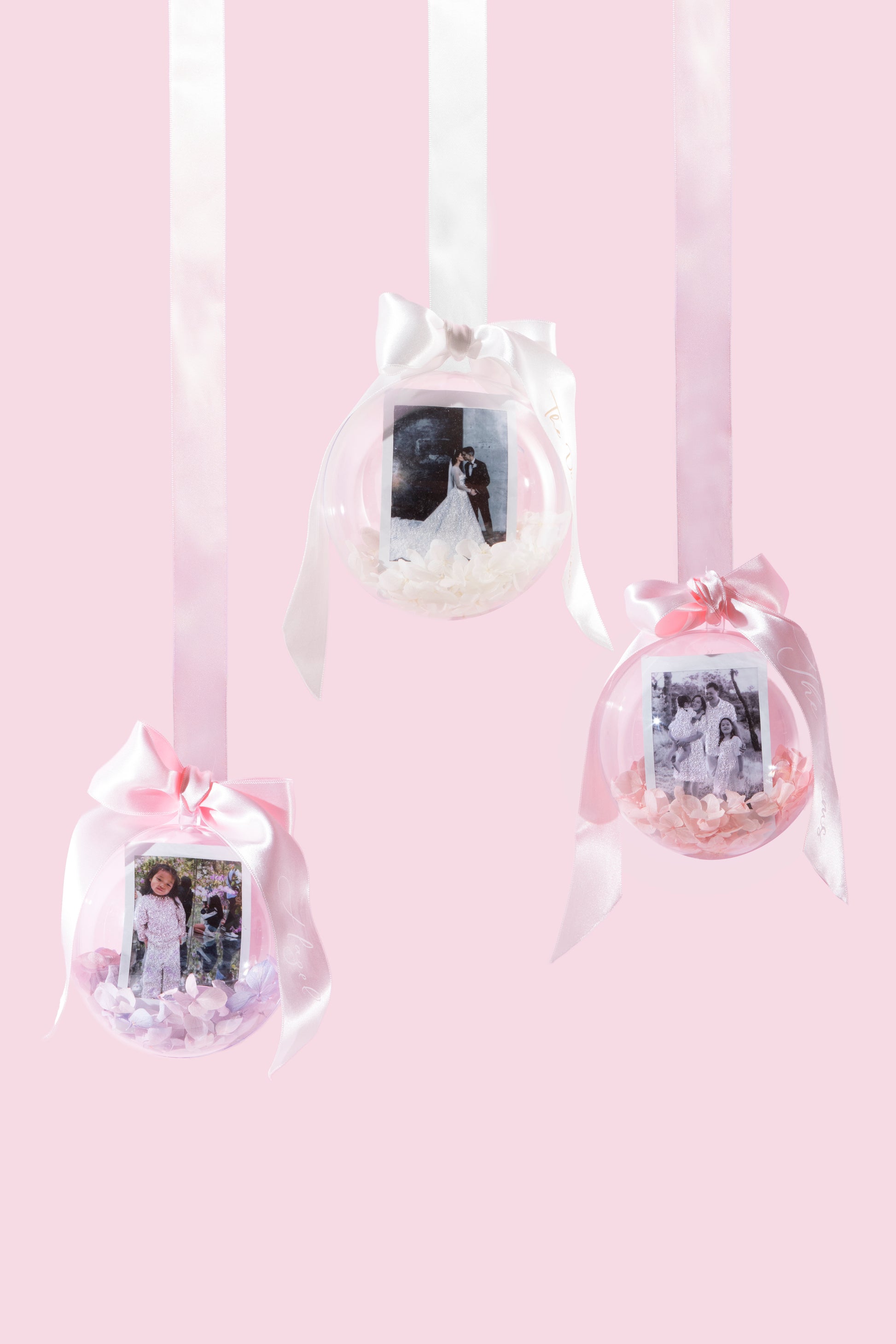 Each bauble frames your precious Polaroid, lovingly hand embellished with shimmering glass glitter, nestled among preserved hydrangeas, and finished with a luxurious satin ribbon for a soft, timeless glow.
